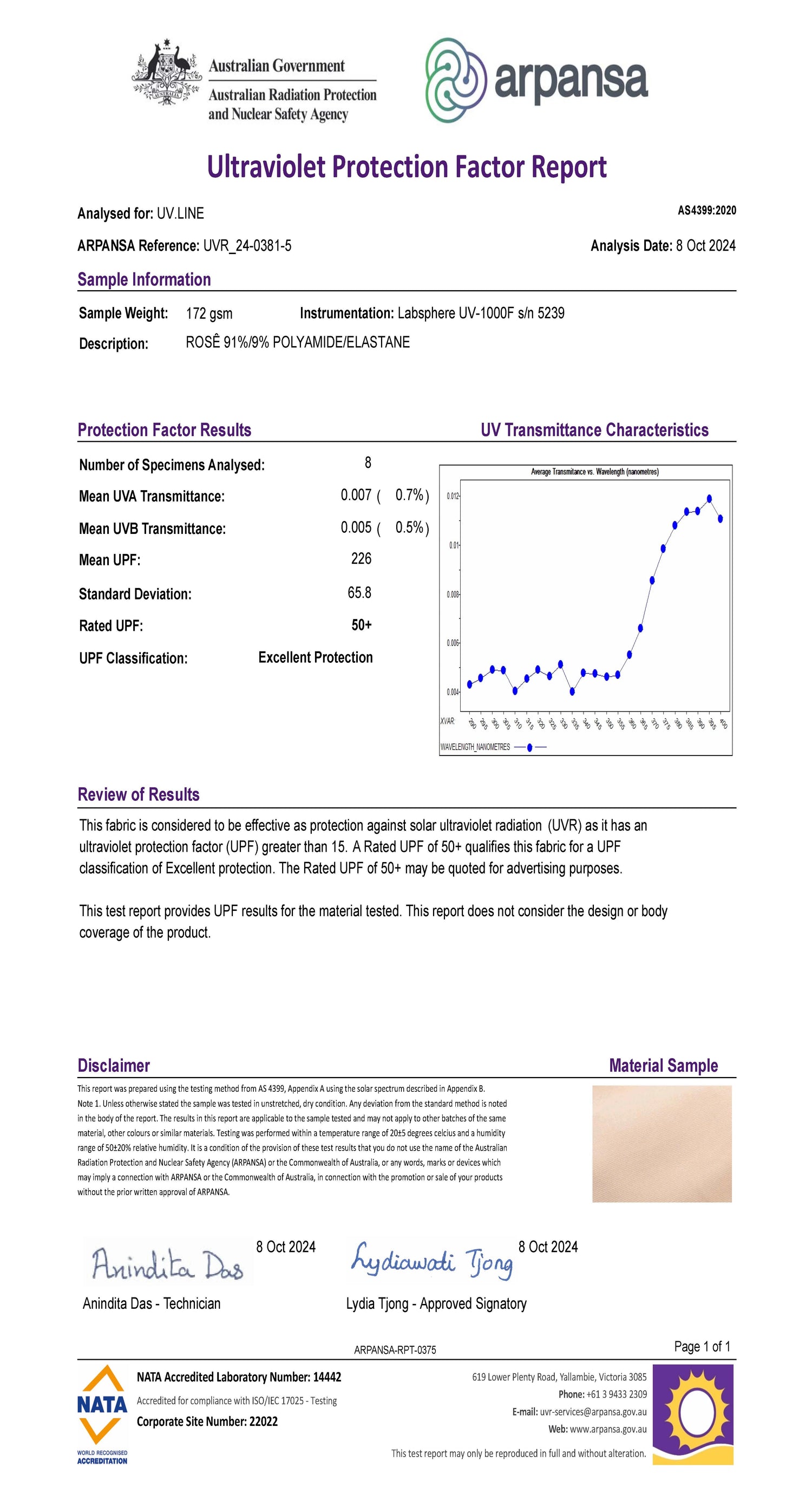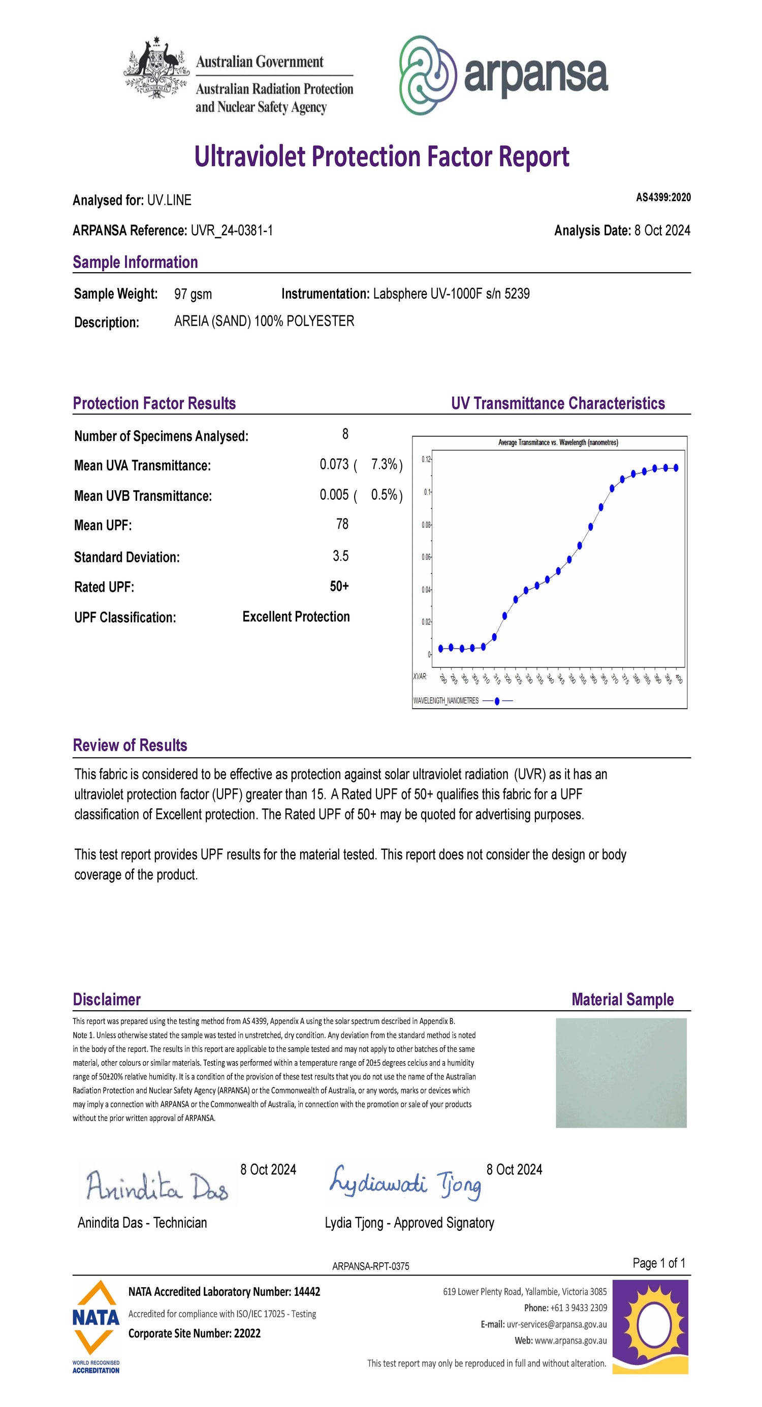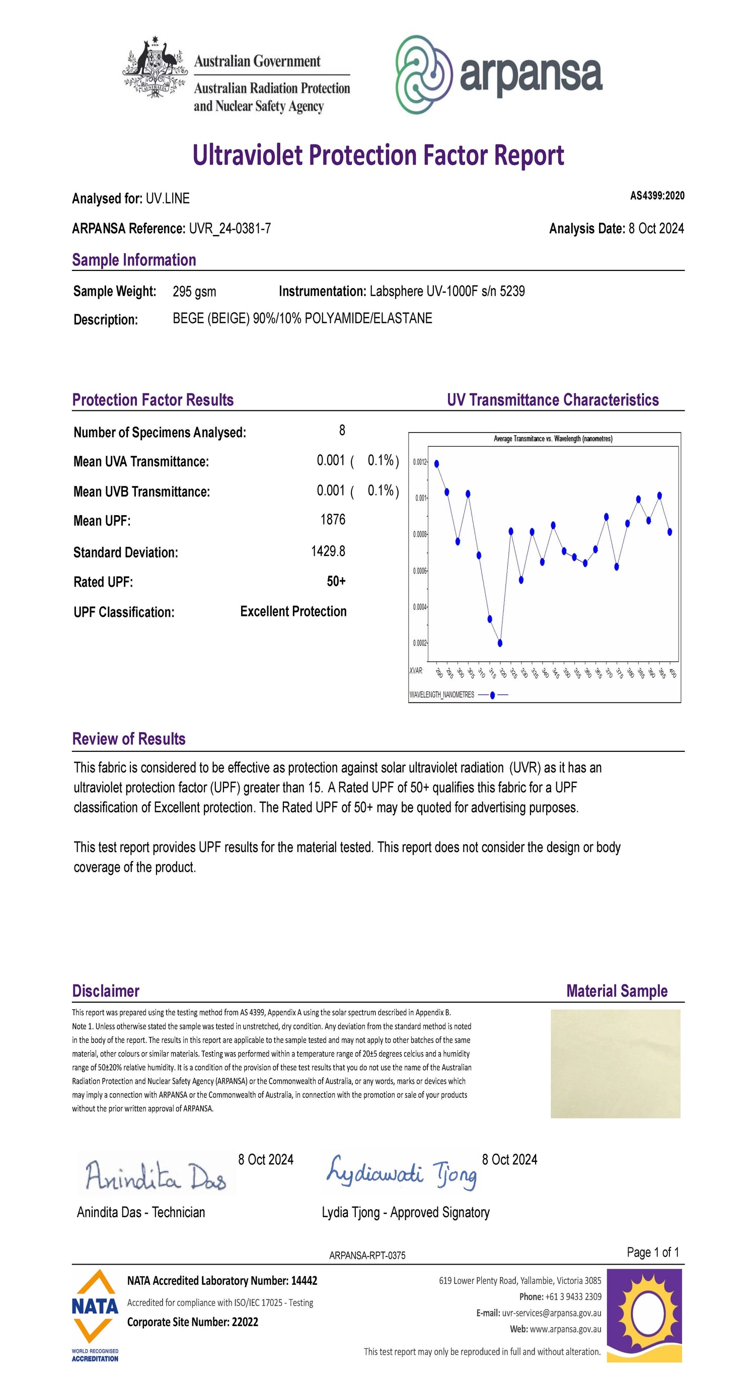 Los tejidos de UV.LINE son cuidadosamente seleccionados y reciben un tratamiento especial que garantiza el bloqueo de más del 98% de la radiación solar. Todos los tejidos son probados y certificados por ARPANSA, entidad australiana que creó la norma para medir la protección ultravioleta en los tejidos y que es referencia mundial en la medición del FPU (Factor de protección ultravioleta).