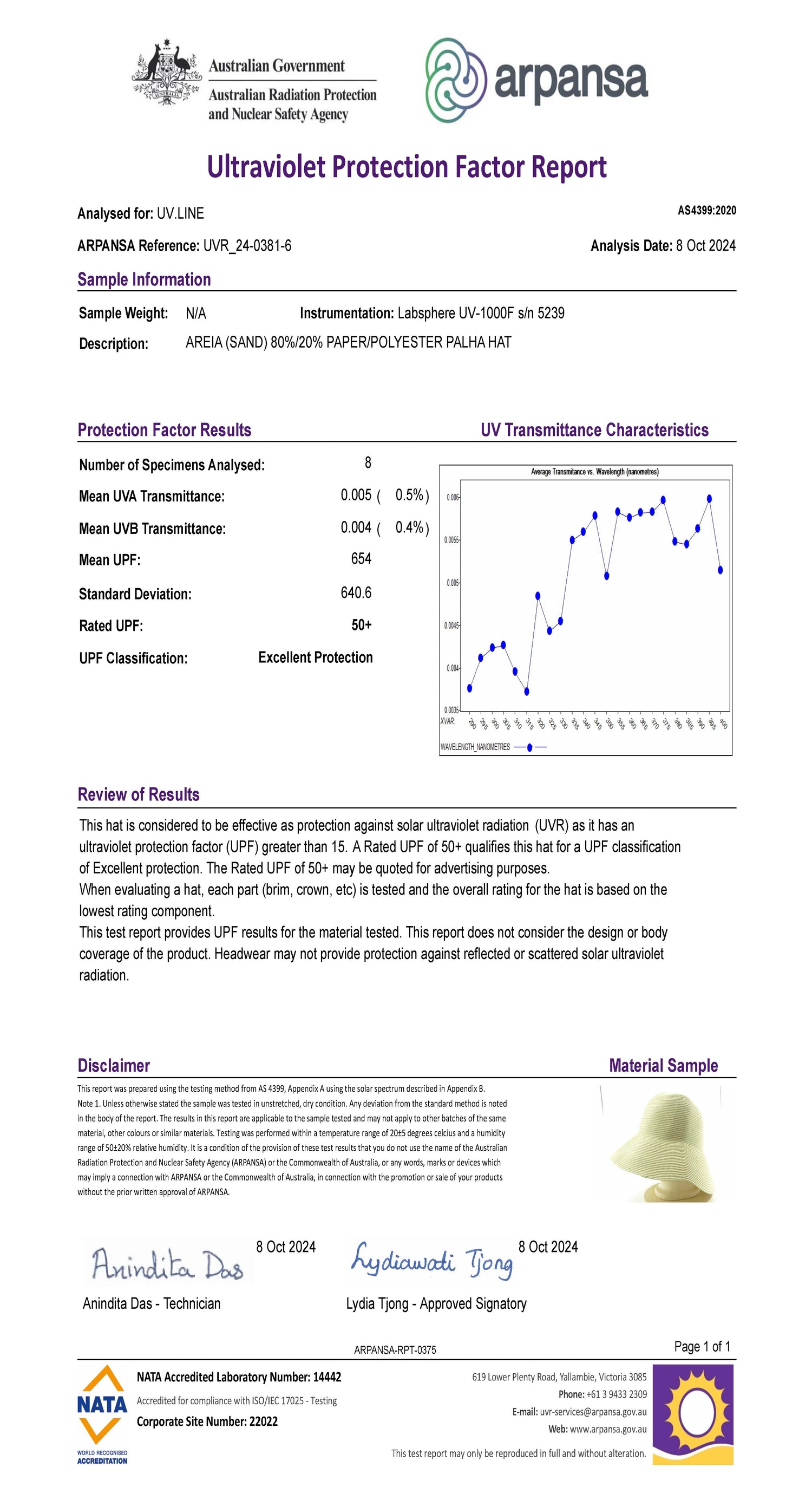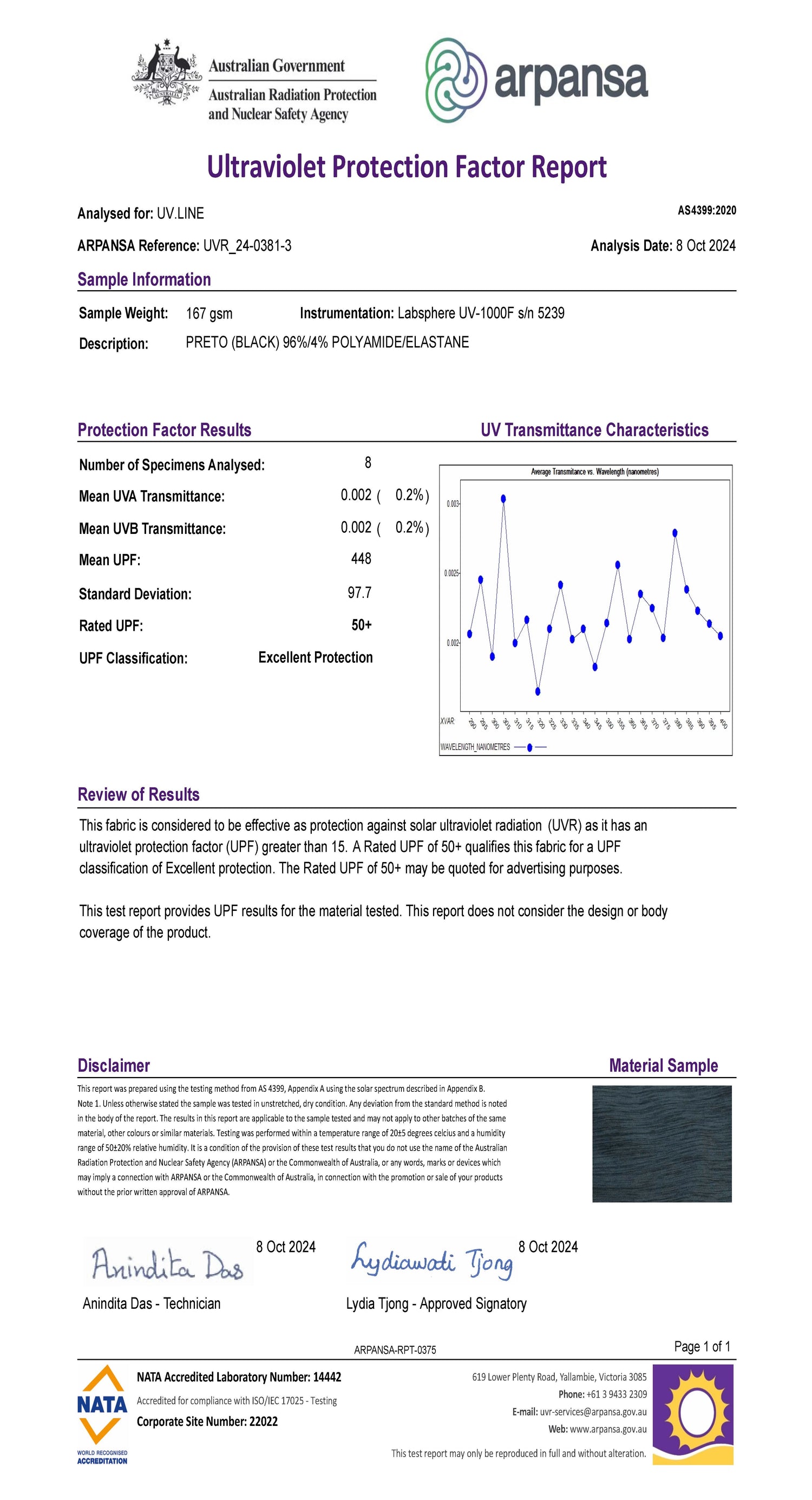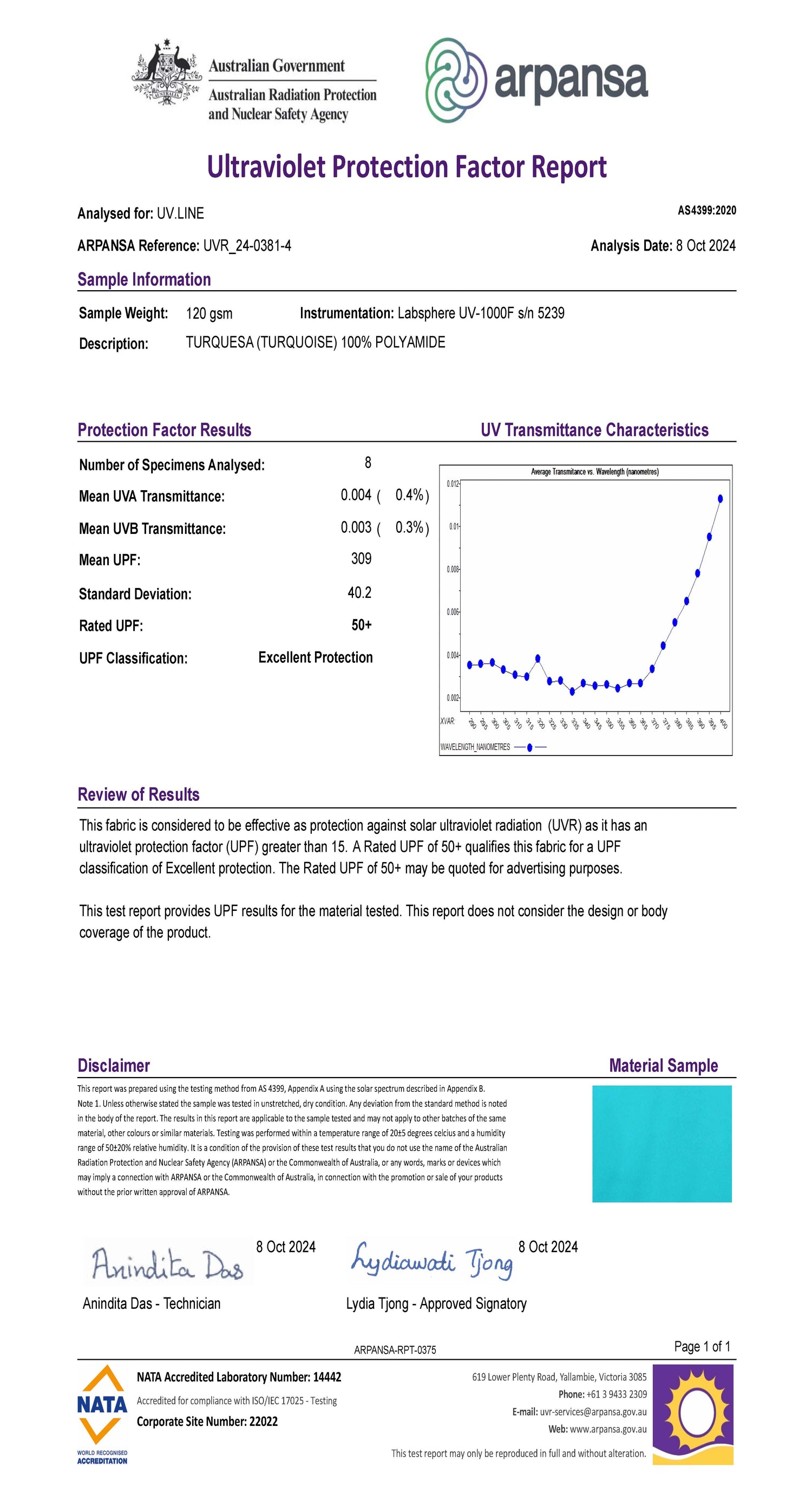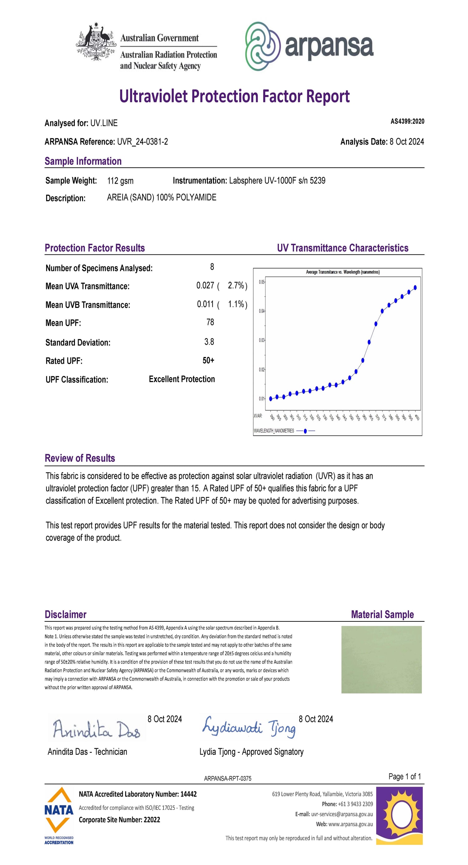 Los tejidos de UV.LINE son cuidadosamente seleccionados y reciben un tratamiento especial que garantiza el bloqueo de más del 98% de la radiación solar. Todos los tejidos son probados y certificados por ARPANSA, entidad australiana que creó la norma para medir la protección ultravioleta en los tejidos y que es referencia mundial en la medición del FPU (Factor de protección ultravioleta).